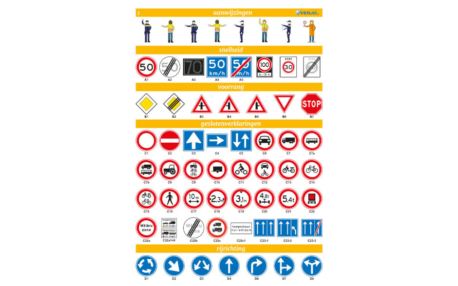 De wandplaten van VERJO zijn onderwijskundig en decorafief zeer verantwoord. Wat is er nu gemakkelijker om leerlingen de betekenissen van borden, gevaarsetiketten of voertuigkenmerken aan te leren, dan ze te tonen? De wandplaten zijn gemaakt van afwasbaar materiaal en zijn UV-bestendig. De wandplaten worden standaard geleverd met ophangbagetten. De afmetingen zijn 70 x 100 cm.