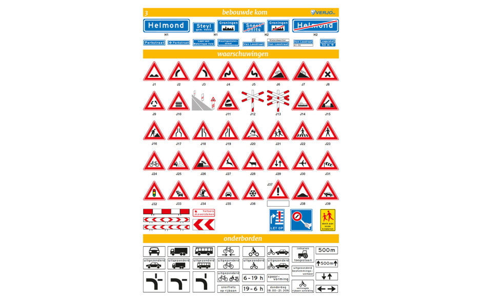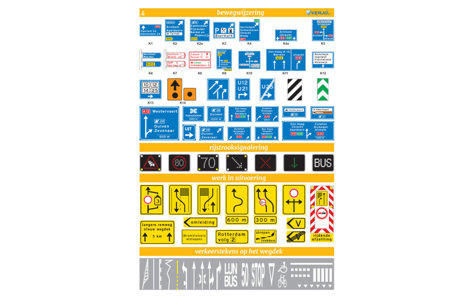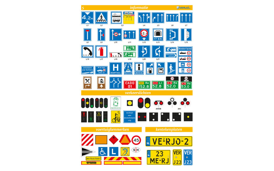 Deze wandplaten bevatten onder andere verkeersborden, onderborden, verkeerstekens, aanwijzingen, tekens op het wegdek en verkeerslichten.
